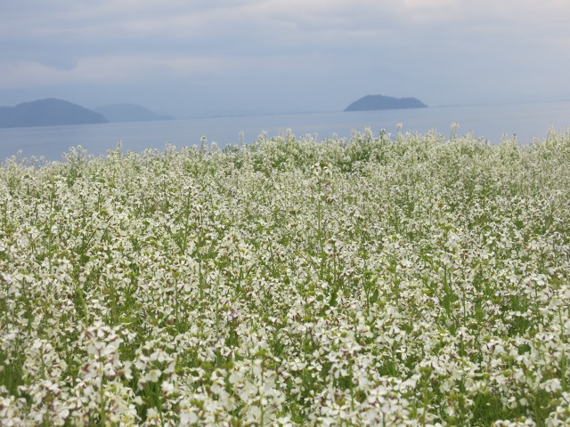 眼の前には、竹生島が浮かび、海津大崎や西浅井の山が迫ってきて湖は入江のように狭くなってきました。水辺にヨシが生い茂り、岸辺にスズシロの花が一面に咲いているのを間近に見ることができます。湖水の透明度も、南の方とは随分違います。